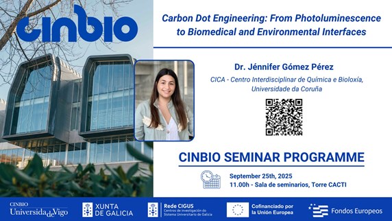 O xoves 25 de setembro a Dr. Jénnifer Gómez Pérez (CICA - Centro Interdisciplinar de Química e Bioloxía, Universidade da Coruña) ofrecerá o seminario "Carbon Dot Engineering: From Photoluminescence to Biomedical and Environmental Interfaces", dentro do ciclo "CINBIO Seminar Programme".