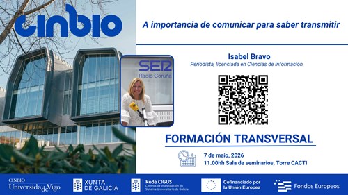 O xoves 7 de maio de 2026, as 11h na sala de seminarios de Torre CACTI, en CINBIO contaremos cun seminario sobre comunicación sobre "A importancia de comunicar para saber transmitir" impartido por Isabel Bravo periodista e licenciada en Ciencias da información.