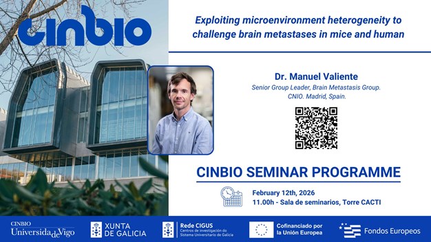O xoves 12 de febreiro, o Dr. Manuel Valiente (Senior Group Leader, Brain Metastasis Group. CNIO. Madrid.) ofrecerá o seminario “Exploiting microenvironment heterogeneity to challenge brain metastases in mice and human" dentro do ciclo CINBIO Seminar Programme.