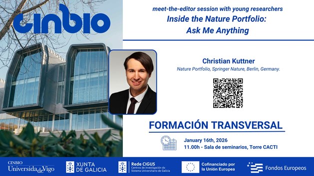 O venres 16 de xaneiro de 2026, Christian Kuttner (Nature Portfolio, Springer Nature, Berlin, Germany) ofrecerá o seminario “Inside the Nature Portfolio: Ask Me Anything" (meet-the-editor session with young researchers) dentro do programa de formación transversal do CINBIO.
