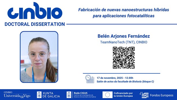 O luns 17 de novembro ás 12:00 horas, Belén Arjones Fernández, do grupo TeamNanoTech (TNT) do CINBIO, defenderá a súa tese de doutoramento baixo o título “Fabricación de nuevas nanoestructuras híbridas para aplicaciones fotocatalíticas".