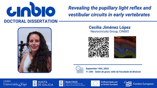 O venres 19 de setembro ás 11:30 horas, Cecilia Jiménez López, do grupo Neurocircuits do CINBIO, defenderá a súa tese de doutoramento baixo o título “Revealing the pupillary light reflex and vestibular circuits in early vertebrates".
