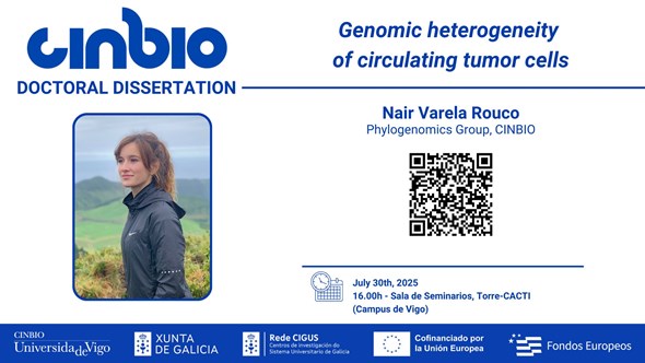O xoves 30 de xullo ás 16:00 horas, Nair Varela Rouco, do grupo de Filoxenómica do CINBIO, defenderá a súa tese de doutoramento baixo o título “Genomic heterogeneity of circulating tumor cells".
