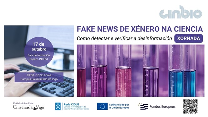 A xornada “Fake news de xénero na ciencia: como detectar e verificar a desinformación”, que terá lugar o venres 17 de outubro, pretende abordar o impacto da desinformación no ámbito científico desde unha perspectiva de xénero, analizando como os bulos e narrativas falsas contribúen a perpetuar estereotipos, reducir a visibilidade das mulleres e debilitar a confianza pública na ciencia.