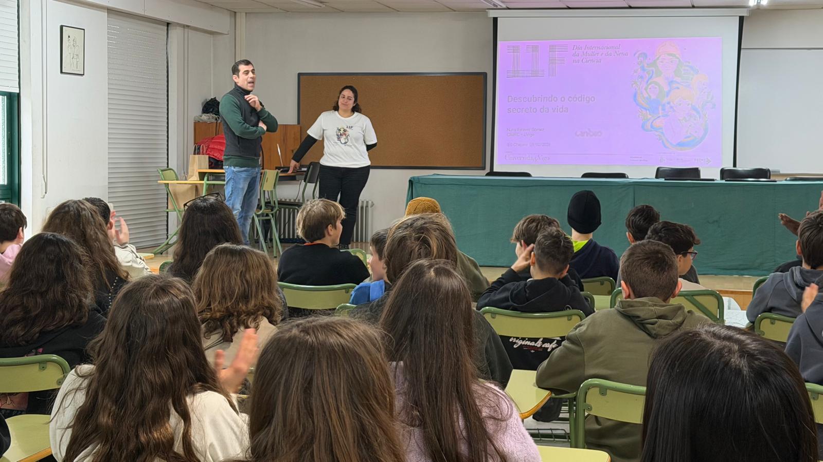 Grazas á colaboración da FECYT e o apoio da Unidade de Igualdade e da UCC+i da UVigo, outro dos puntos fortes da programación do 11F nesta institución foron as charlas divulgativas en centros educativos. A través desta iniciativa, as científicas do CINBIO puideron conversar con arredor de 400 estudantes de varios niveis educativos, desde 3º de Primaria ata 1º de Bacharelato, a través da súa visita a diferentes escolas e institutos ubicados en concellos da nosa contorna, como Redondela, Ponteareas, O Porriño, Ribeira, Vigo ou Salvaterra do Miño. Nesta edición de 2026 Nuria Estévez Gómez, Mercedes Peleteiro Olmedo, Andrea Fernández Carrera, Lara González Cabaleiro, Sarai Moledo Rodríguez, Laura Ceide Sandoval, Susana Magadán Mompo, Andrea Hernández, Silvia Lorenzo, Paula Lorenzo Fernández, Ainhoa Rodríguez Tébar, Elena Frediani e Valeria Zoni foron as científicas do CINBIO que se sumaron a esta iniciativa que cada ano achega ao alumnado referentes femininos próximos.