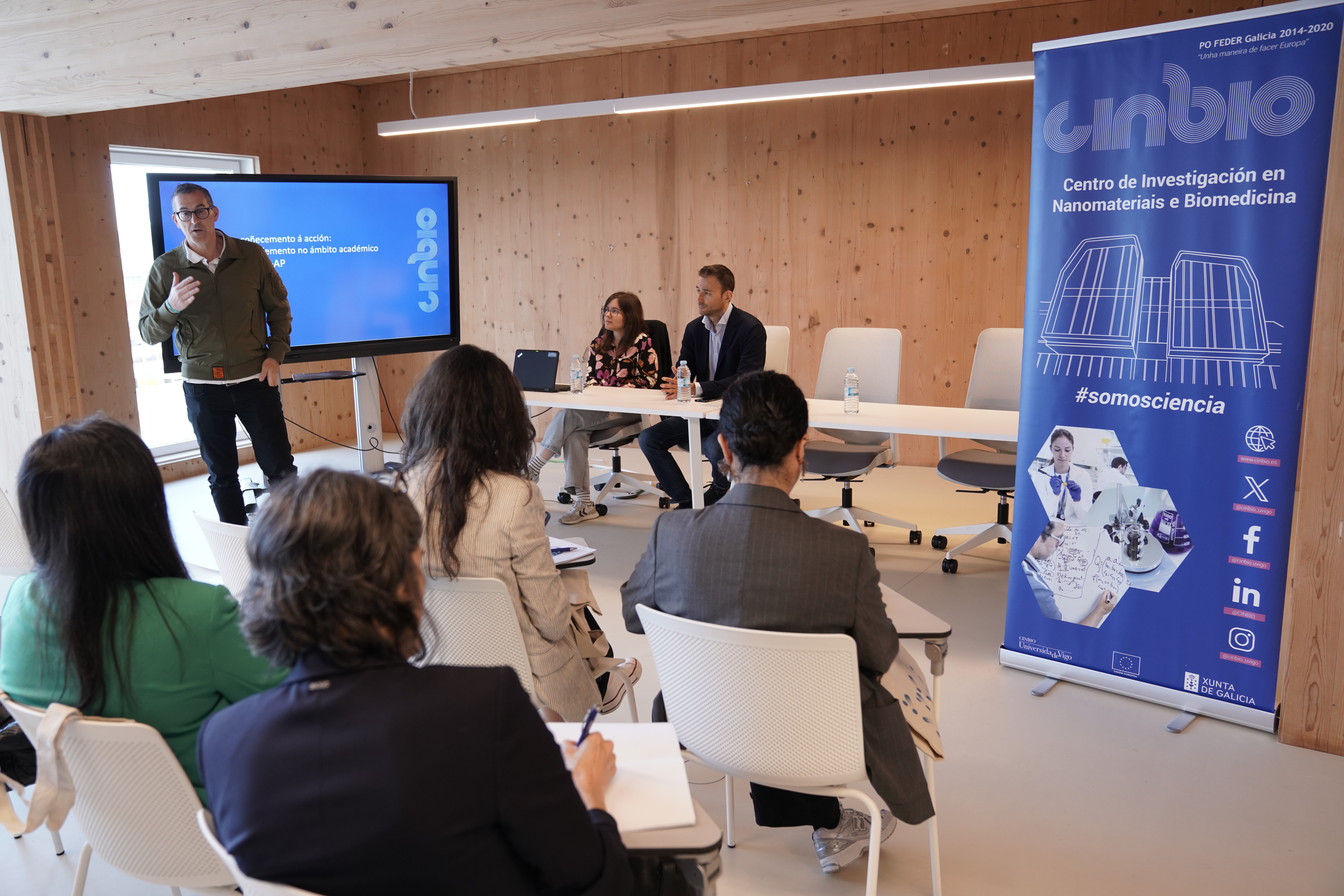 O edificio Redeiras acolleu este xoves o lanzamento da iniciativa coa celebración da xornada “Do coñecemento á acción: emprendemento no ámbito académico”. O director do CINBIO Miguel Correa foi o encargado de dar a benvida aos asistentes, subliñando no seu discurso a importancia deste proxecto que “busca posicionarse como un referente en asesoramento científico en emprendemento e innovación no ámbito dos nanomateriais e biomedicina”. Fíxoo na apertura institucional do acto, que tamén contou coa participación de Pilar Montes, xestora da Unidade de Transferencia e Innovación do CINBIO, encargada de presentar as actividades e accións que conformarán o programa EMPREN+AP durante o próximo ano.