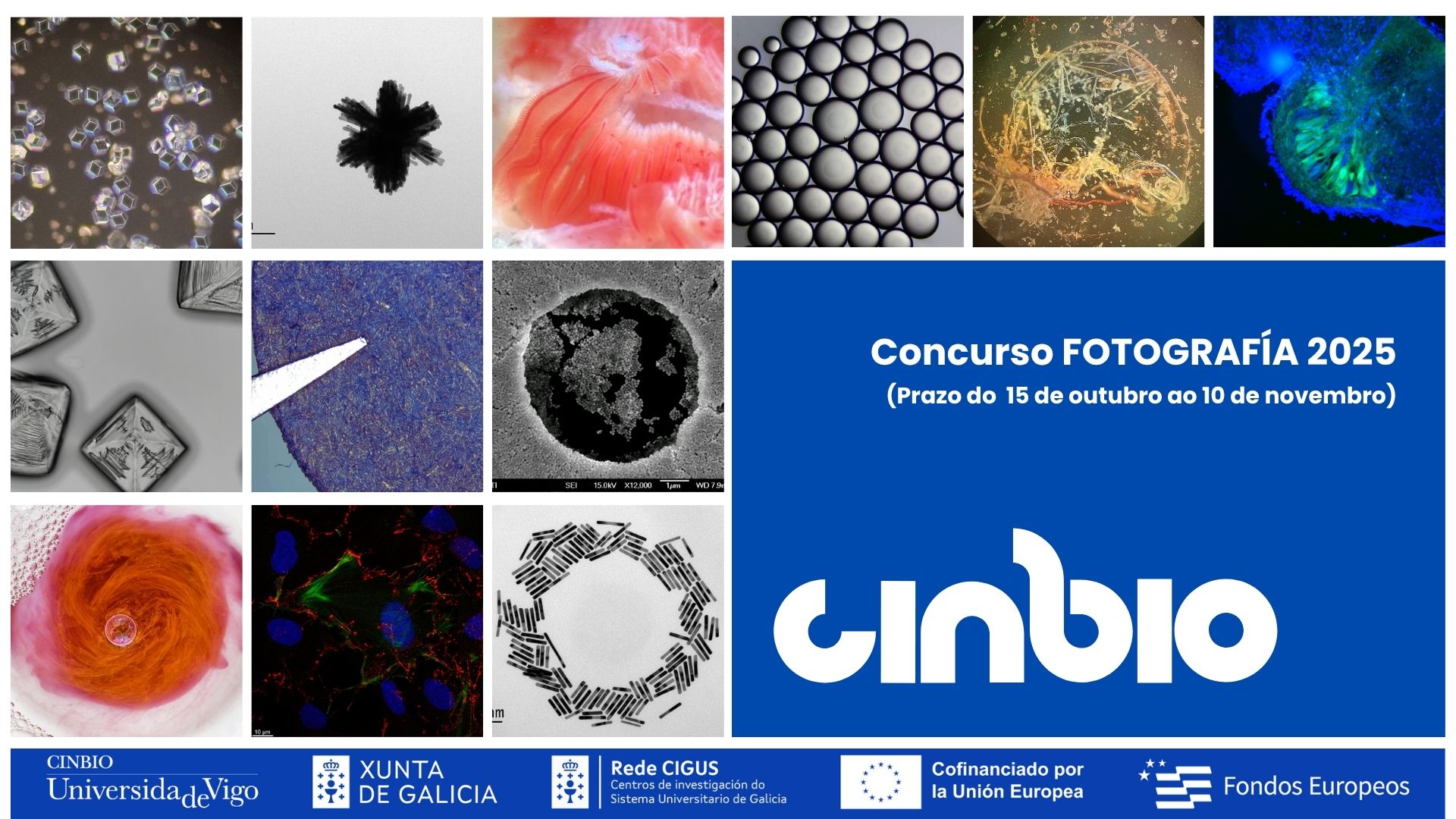 O V Concurso de fotografía CINBIO (2025) é unha iniciativa promovida polo Centro de Investigación en Nanomateriais e Biomedicina da Universidade de Vigo, e pertencente á Rede CIGUS, co obxectivo de promocionar o traballo desenvolvido no centro a través de fotografías realizadas polo seu persoal investigador.