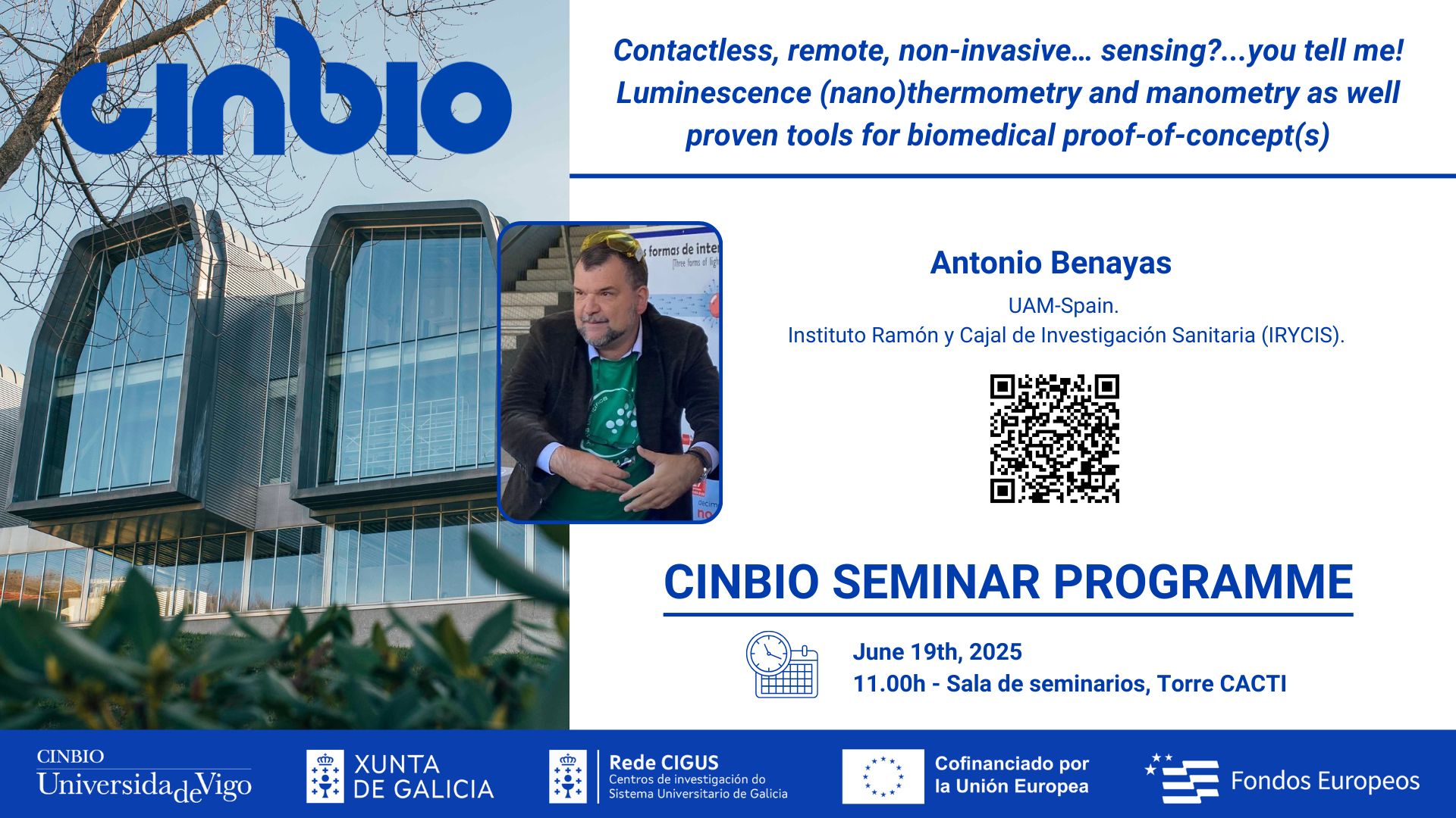 O xoves 19 de xuño de 2025, Dr. Antonio Benayas (Universidad Autónoma de Madrid (UAM, Spain)) ofrecerá o seminario “Contactless, remote, non-invasive… sensing?...you tell me! Luminescence (nano)thermometry and manometry as well proven tools for biomedical proof-of-concept(s)" dentro do ciclo CINBIO Seminar Programme.